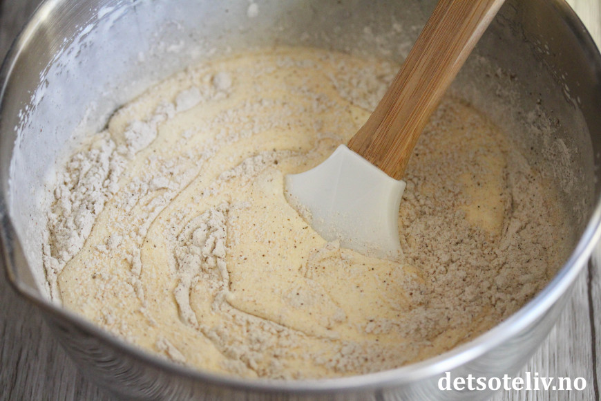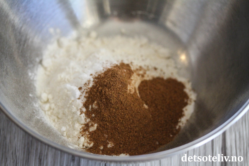 Bland krydder og natron med hvetemelet. Vend dette inn i deigen.