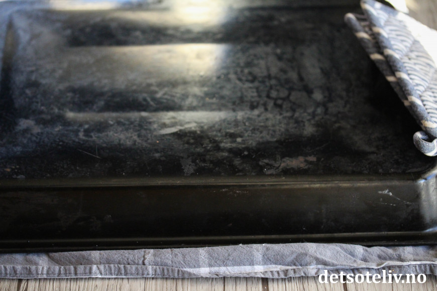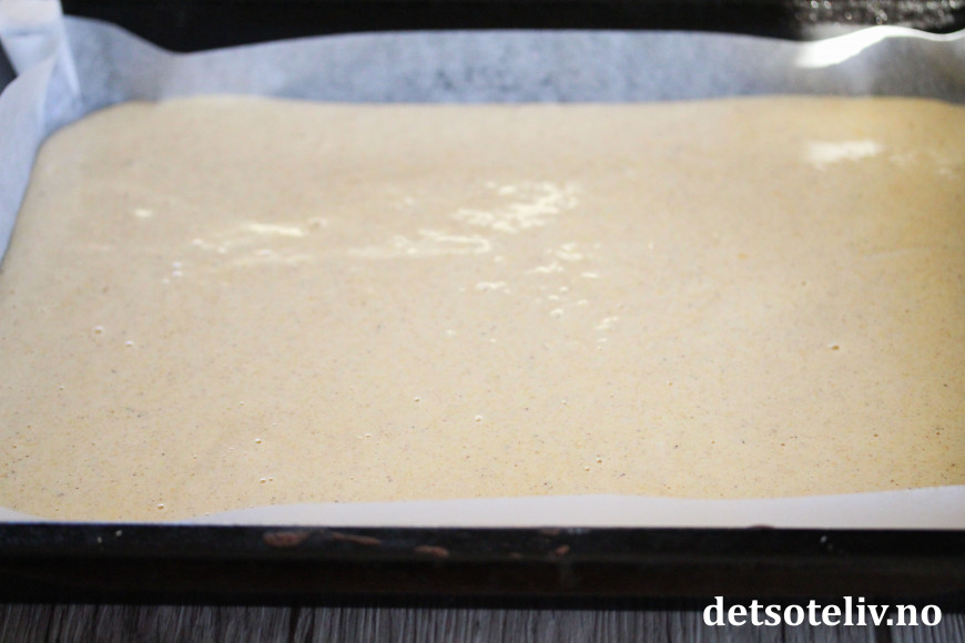 Fordel deigen utover i en stor, bakepapirkledd langpanne (ca. 30 x 40 cm).