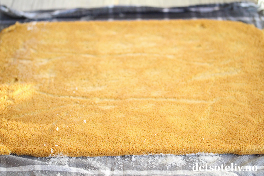 ♥ Det er viktig at du drar av bakepapir mens kaken er varm. Dersom du synes det henger for godt fast til kaken, hjelper det å fukte bakepapiret med litt vann før du drar det av. Kaken må avkjøles med den varme langpannen over for at den skal holde seg myk, slik at den kan rulles uten å sprekke. La kaken avkjøles under langpannen til den er helt kald, ellers smelter ostekremfyllet.