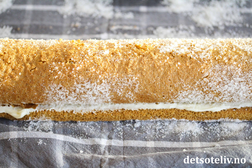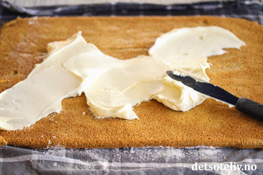 Smør ostekremen over den avkjølte kakebunnen. Rull kaken sammen fra langsiden og renskjær kantene.