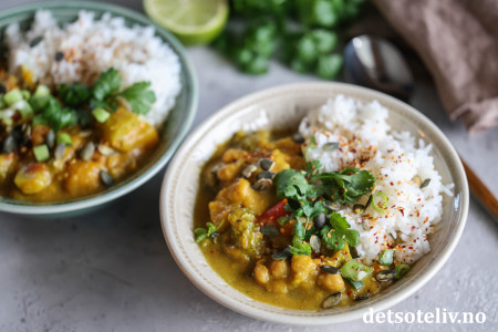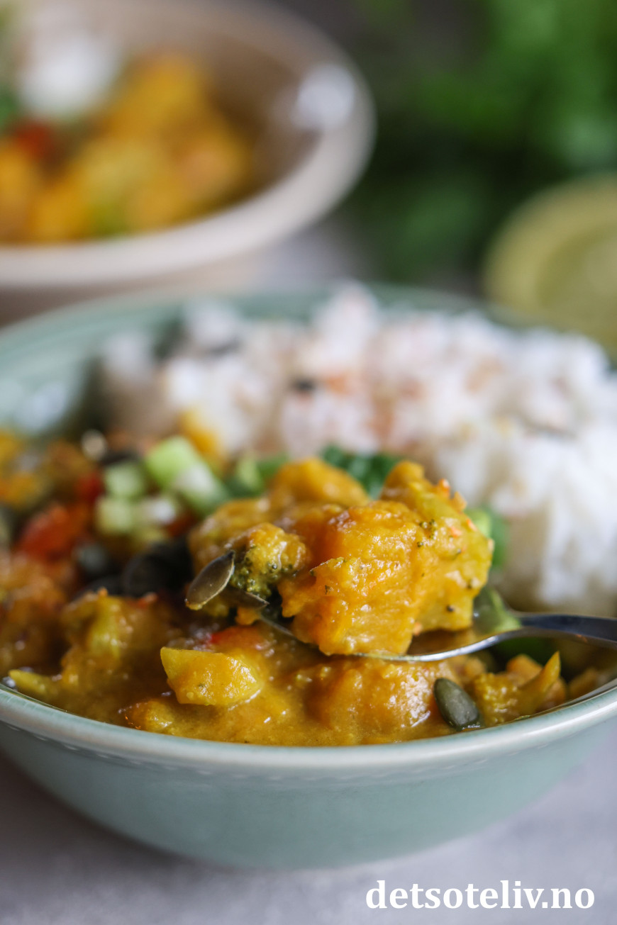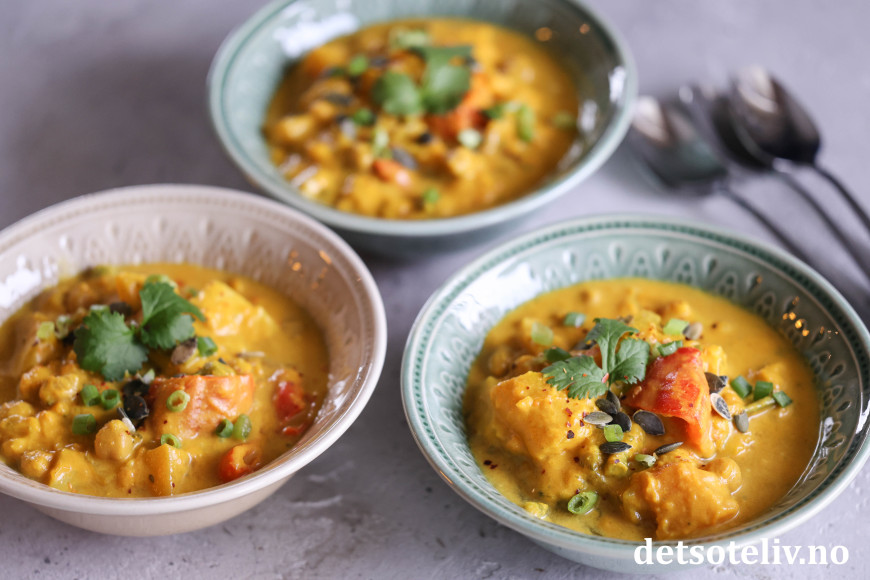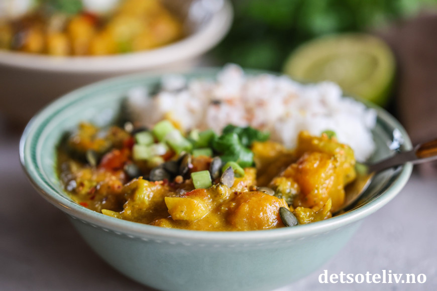 Nå begynner det å bli rimelig kaldt ute, så da kan det smake med en varmende gresskarcurry! Denne curryen er dessuten vegetarisk og stappfull av sunne grønnsaker og kikerter, som jo passer bra nå i starten av januar. 😊