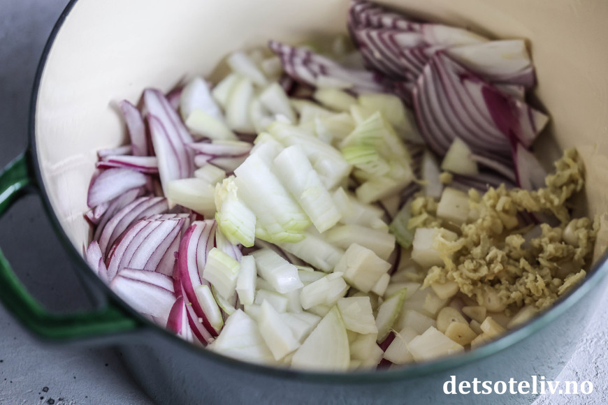 Ha olje i en gryte. Skrell løk og rødløk og skjær i skiver. Ha løken i gryten sammen med fint hakkede hvitløksfedd og revet ingefær.
