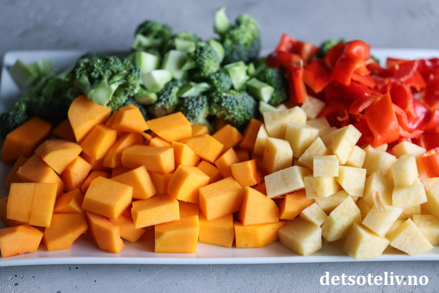 Finn frem grønnsakene du vil bruke. Skrell og rens gresskar og skjær i terninger og mål opp mengden. Gjør det sammen med resten av grønnsakene.