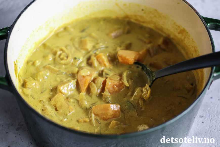 ♥ Du kan variere curryen ved å tilsette andre type grønnsaker sammen med gresskar, for eksempel gulrot, sellerirot, purreløk, gul paprika, tomater osv, så dette er en fin anledning til å rydde opp i grønnsaksskuffen.
