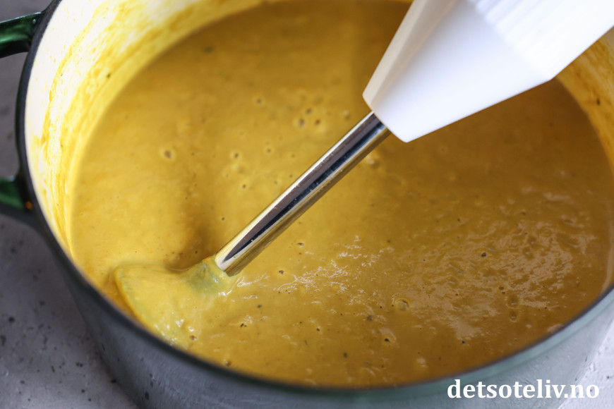 La det hele koke sammen under lokk i 30 - 45 minutter, eller til gresskarterningene er skikkelig møre. Finn frem en stavmikser og mos alt i gryten sammen til en jevn, tykk suppe.