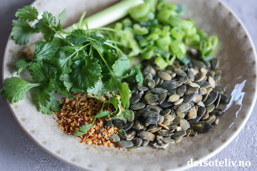 Dryss gjerne hakket vårløk, gresskarkjerner, litt chiliflak og frisk koriander over som topping.