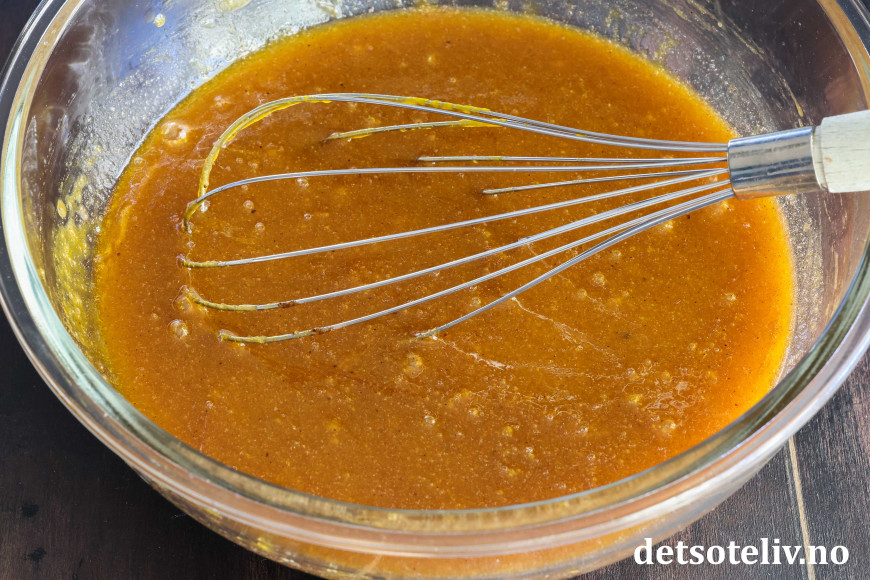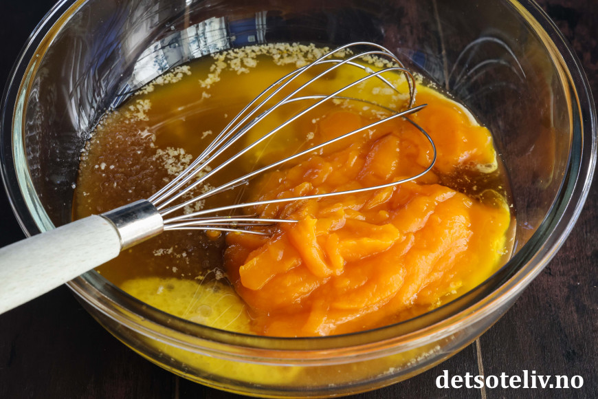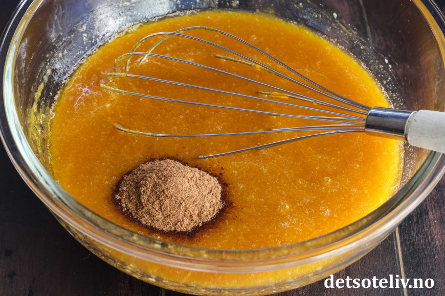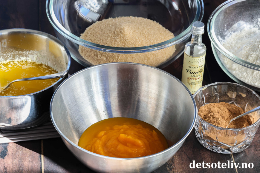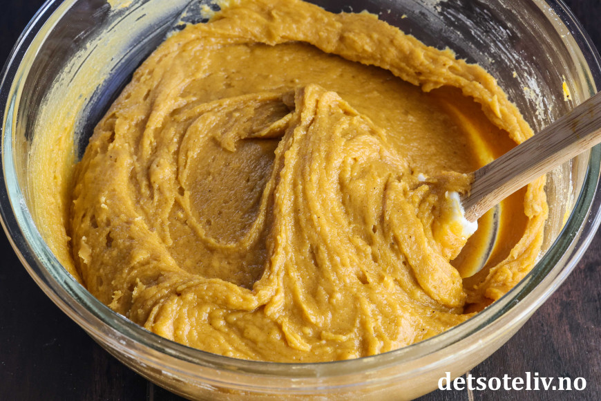 Smelt smøret og bland det sammen med brunt sukker, gresskarpuré og vaniljeekstrakt.