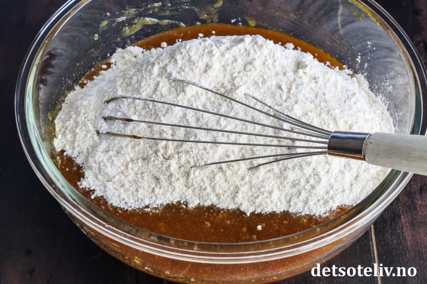 I en annen bolle blander du sammen hvetemel, maisenna og bakepulver. Bland dette inn i kakedeigen (det skal bli en temmelig tykk og kompakt deig).