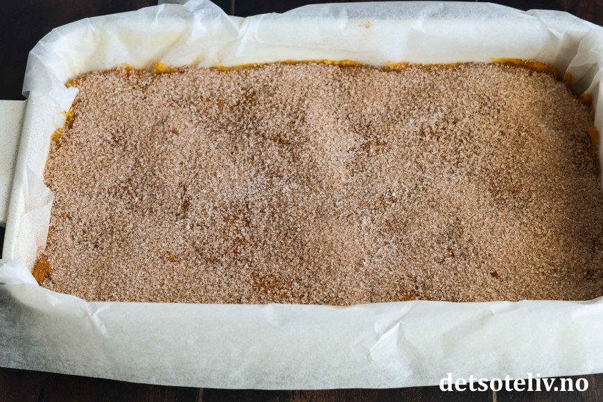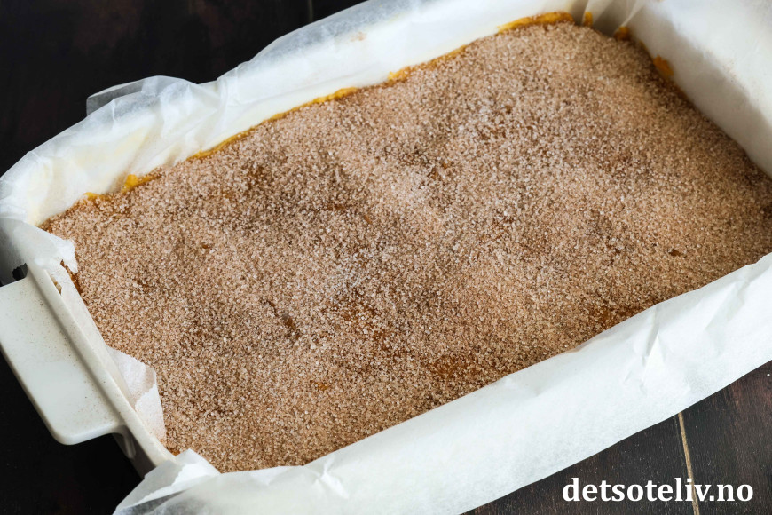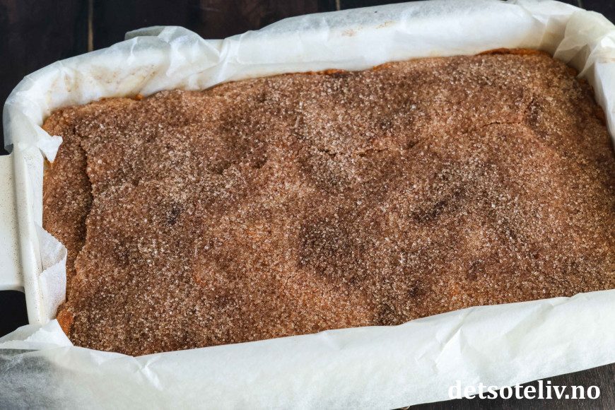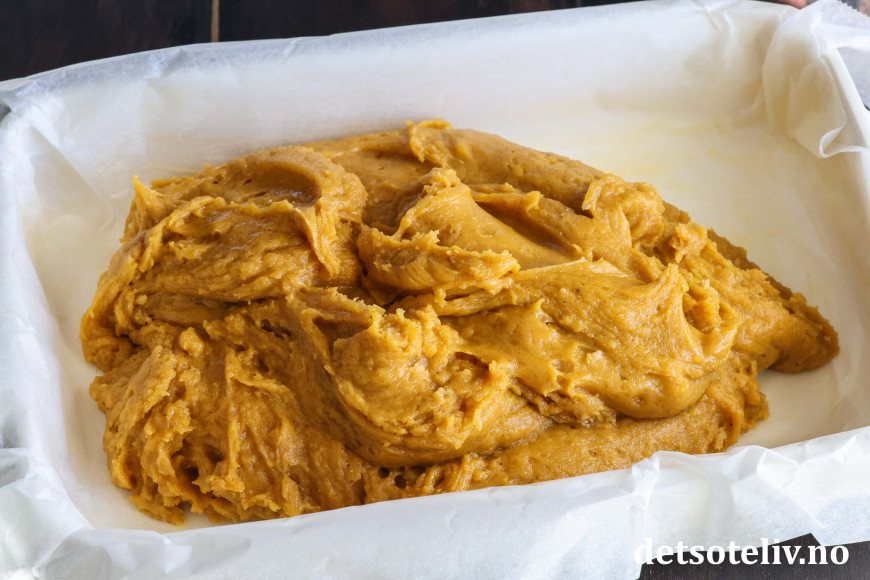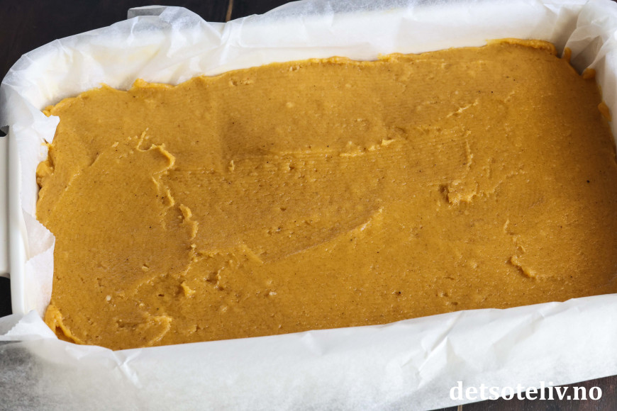Fordel deigen i en liten, bakepapirkledd langpanne (ca. 20 x 30 cm). Jevn til overflaten.