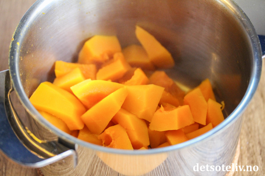 Damp gresskarkjøttet i en kjele med litt vann, til bitene har blitt helt møre.