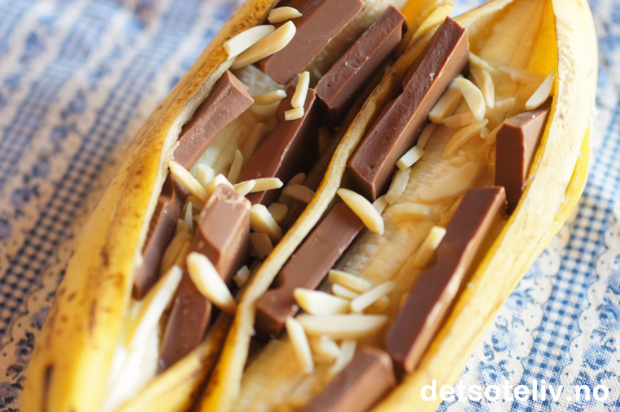 Stapp sjokoladebiter inn under bananskallet - bruk så mye sjokolade du får plass til Dryss over mandler. Jeg bruker strimlede, skåldede mandler.