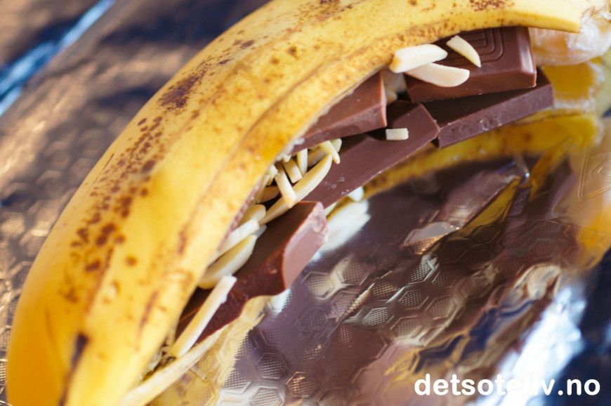 Stapp sjokoladebiter inn under bananskallet - bruk så mye sjokolade du får plass til.