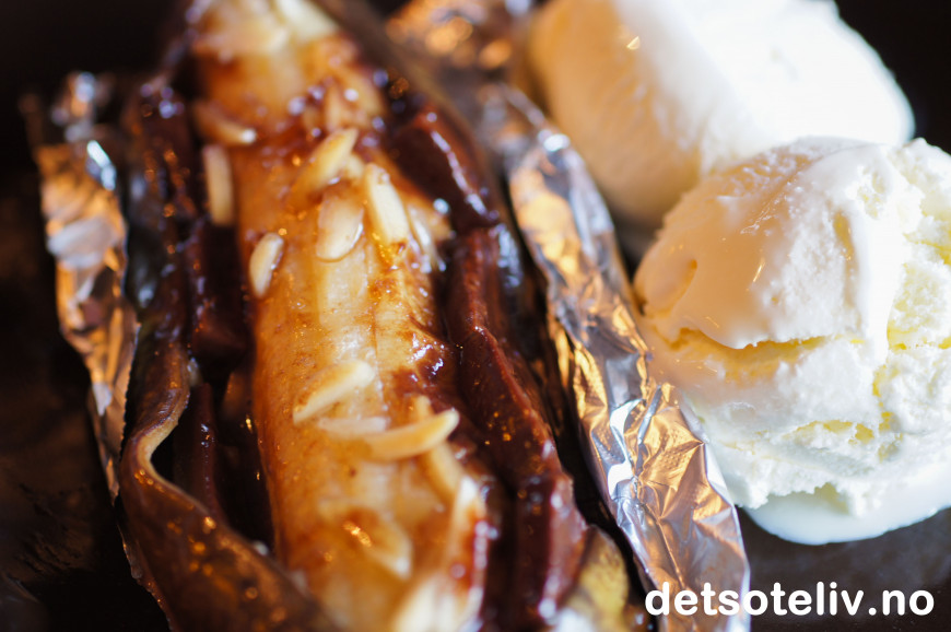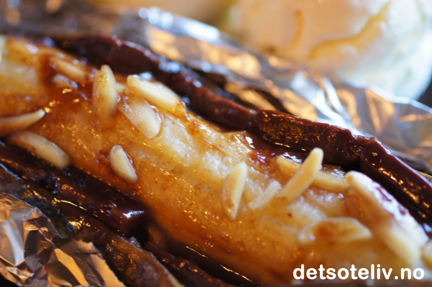 Grillet banan med smeltet sjokolade og mandler smaker nydelig. Serveres varm med vaniljeis.