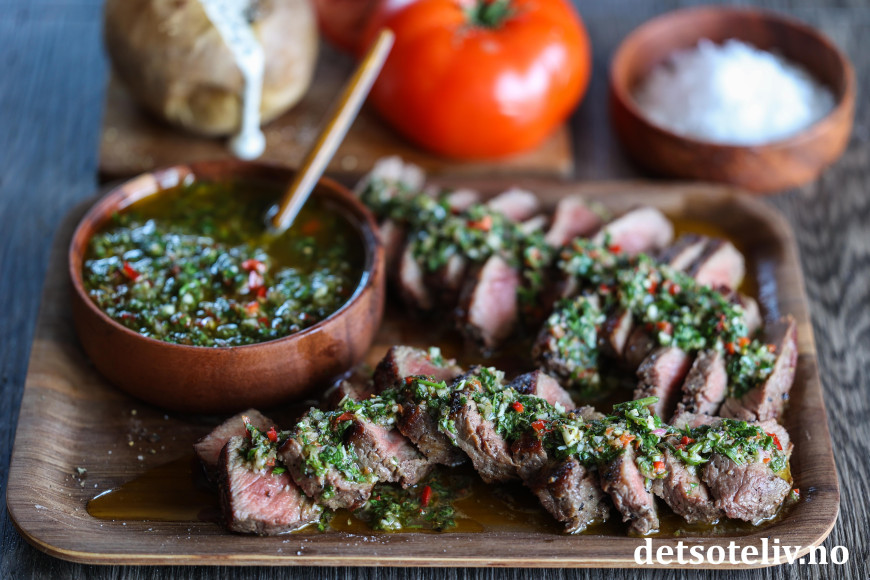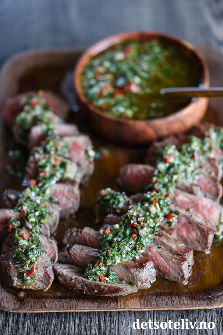 Den argentinske urtesausen Chimichurri gjør seg utrolig godt som tilbehør til en saftig biff.