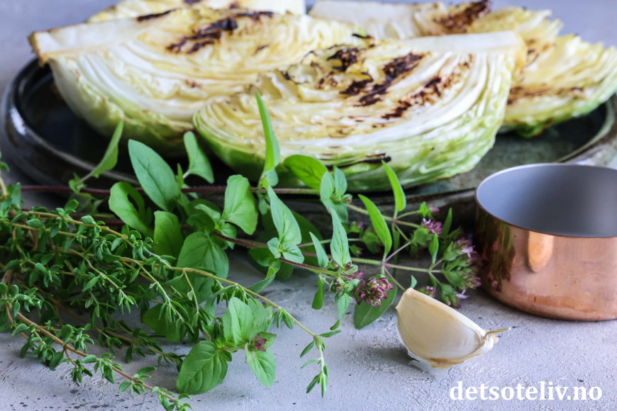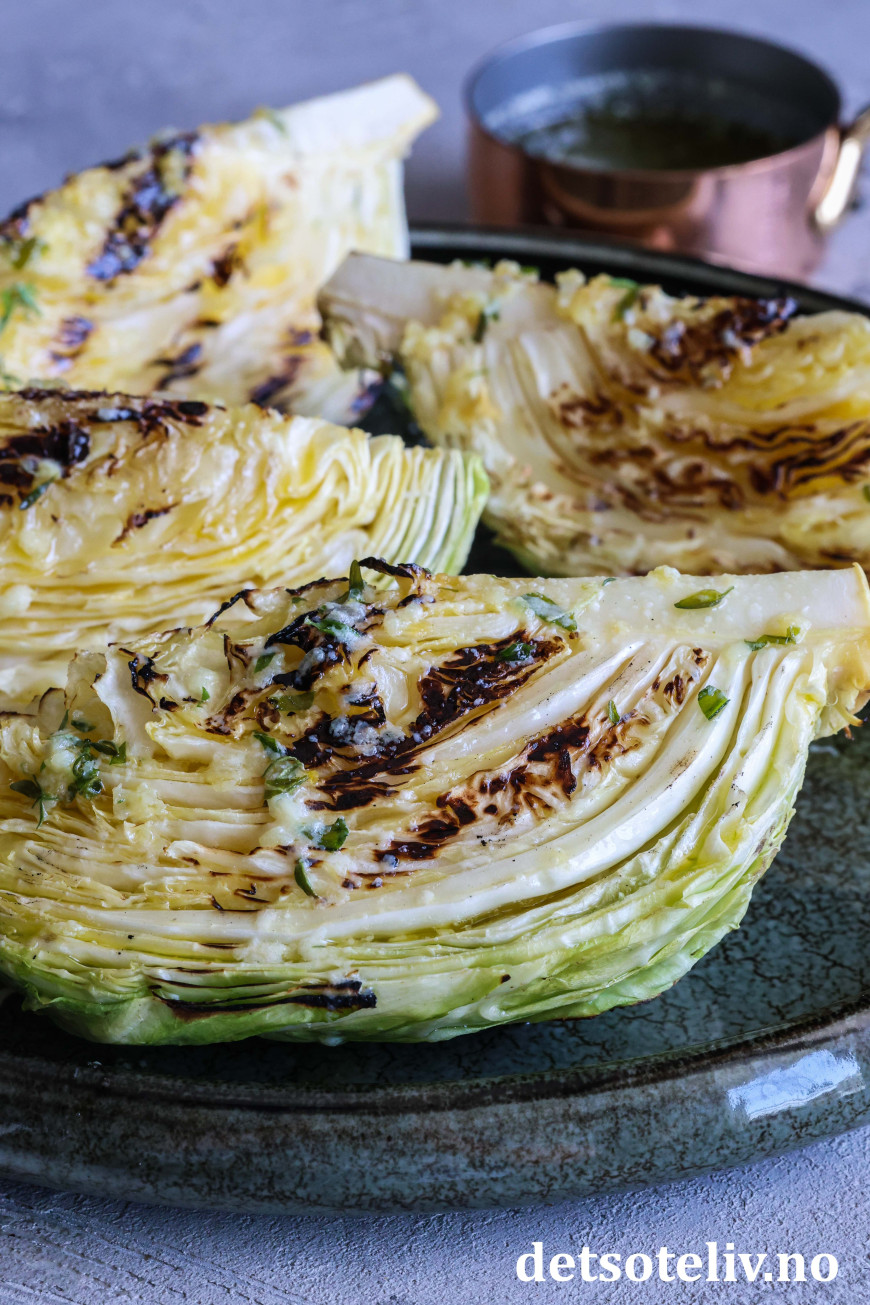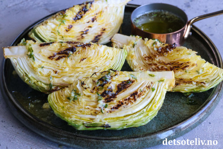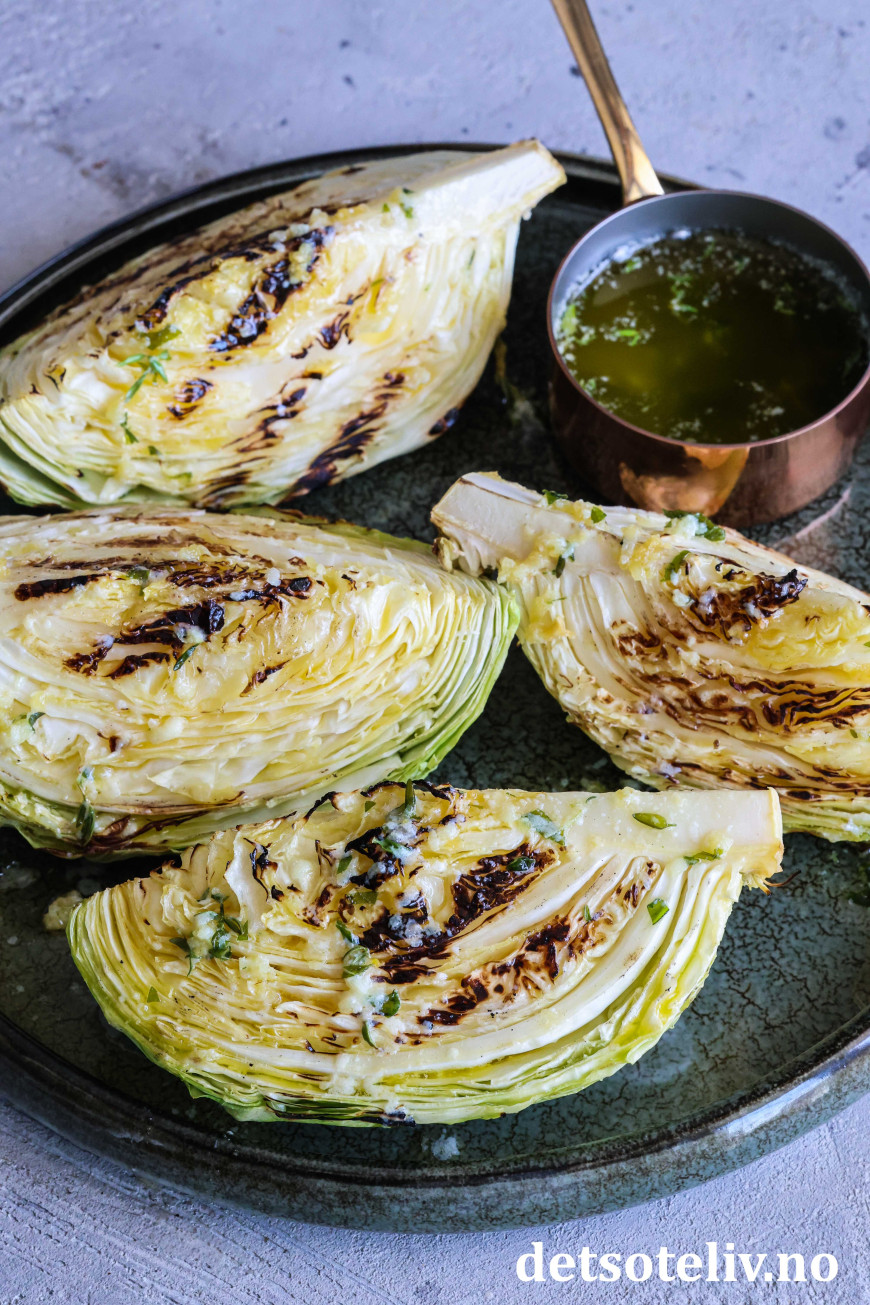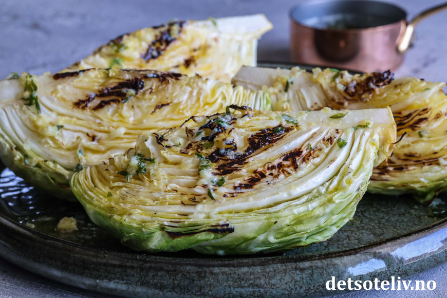 Legg nygrillet spisskålen på tallerkenen og øs over det varme urte- og hvitløkssmøret slik at smøret renner litt ned mellom bladene på kålen.