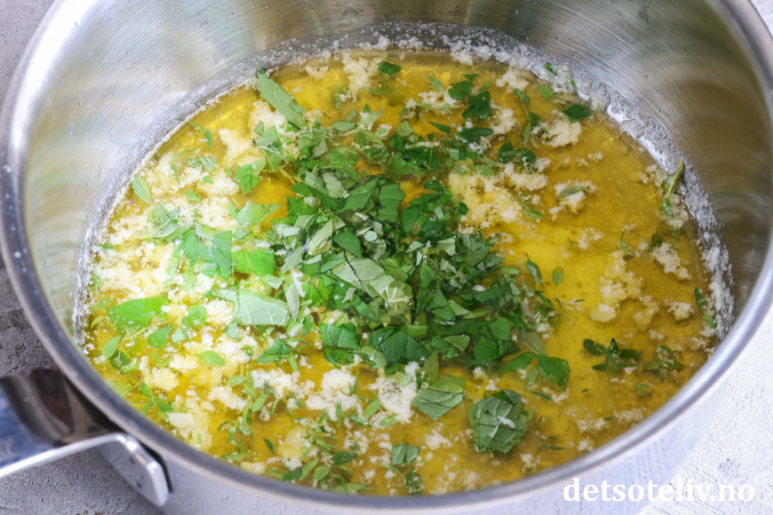 Til urte- og hvitløkssmøret smeltes først smøret i en liten kjele. Ta kjelen av platen og tilsett presset hvitløksfedd og fint hakkede urter. Rør om.