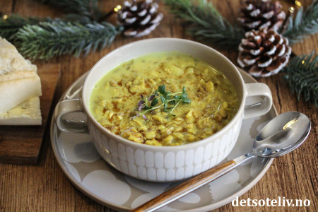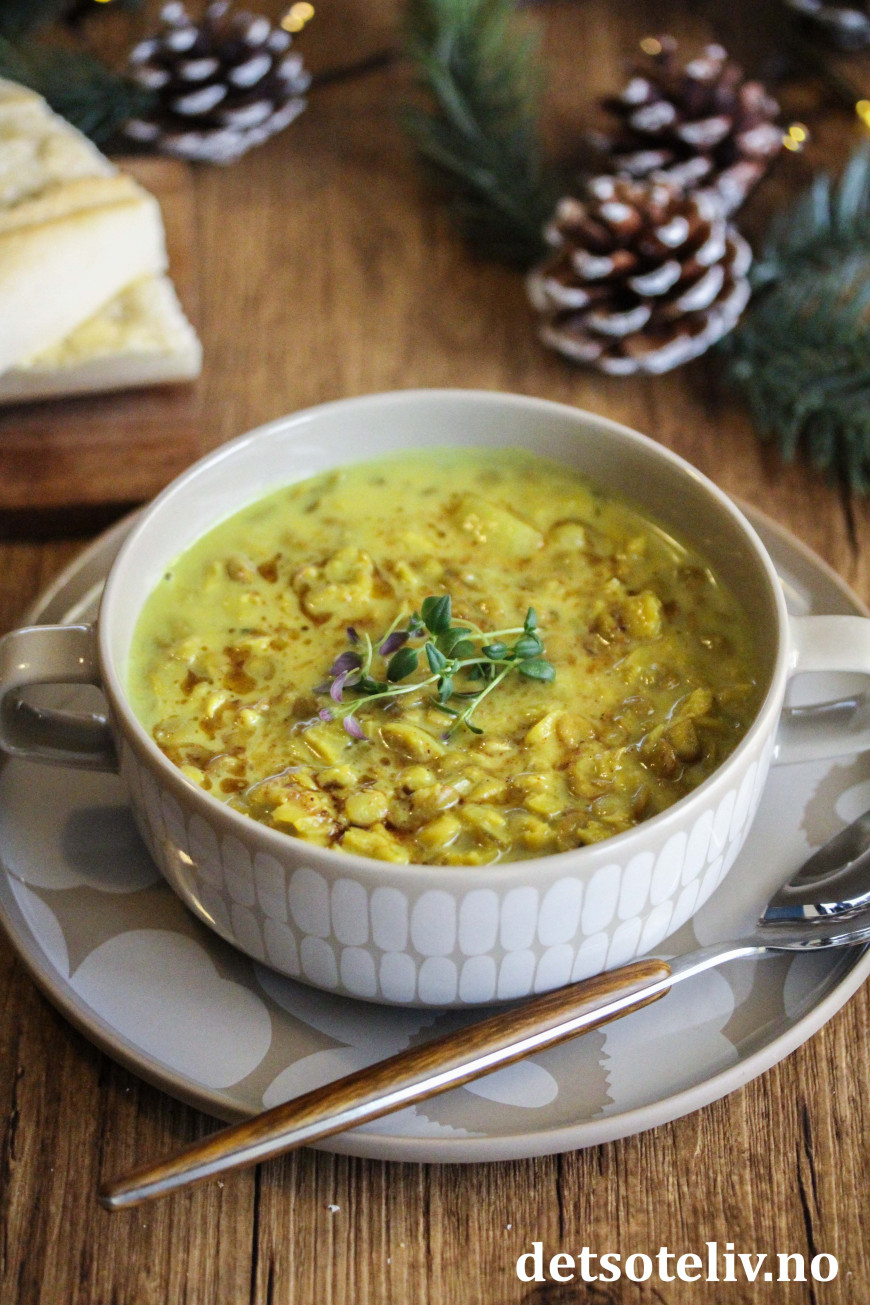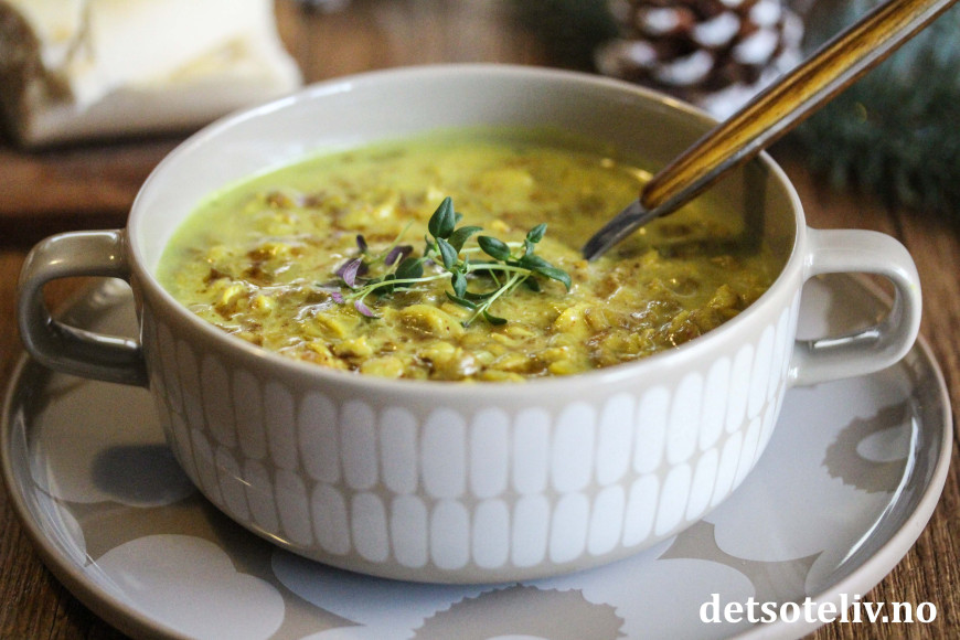 Denne nydelige linsesuppen lages med grønne linser, løk og kokosmelk. Fersk timian og gurkemeie gir deilig smak. Ved servering drypper man en teskje krydret smør over suppeskålen, som virkelig høyner smaksopplevelsen! 😍