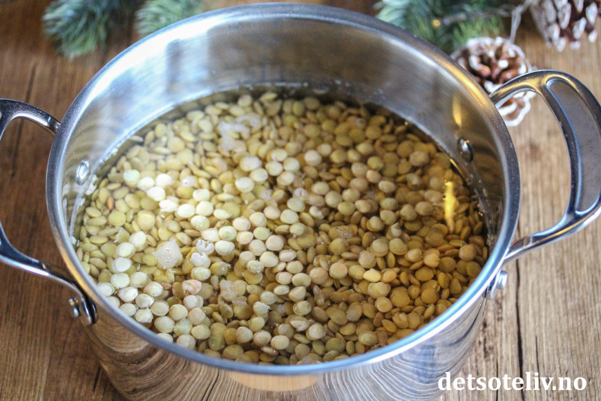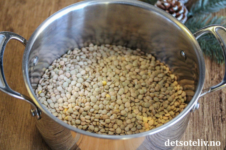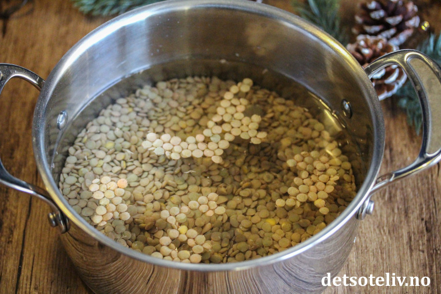 ♥ Jeg bruker her tørre, grønne linser. Disse bør legges i bløt kvelden i forveien. Husk å skylle bort bløtleggingsvannet. Etter at linsene er ferdig bløtlagt, trenger de ikke mer enn 20 - 30 minutter småkoking for å bli møre.