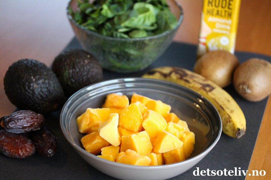 Ha frossen mango (se tips), banan, avokado, hakkede dadler og spinatblader i en blender. Kjør blandingen sammen slik at alt moser seg jevnt og spe med mandelmelken til ønsket tykkelse.