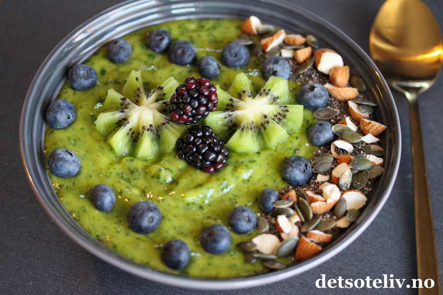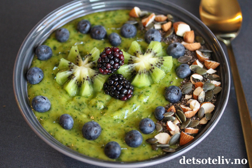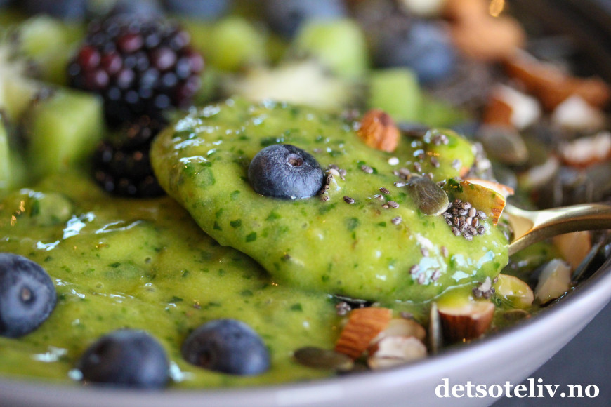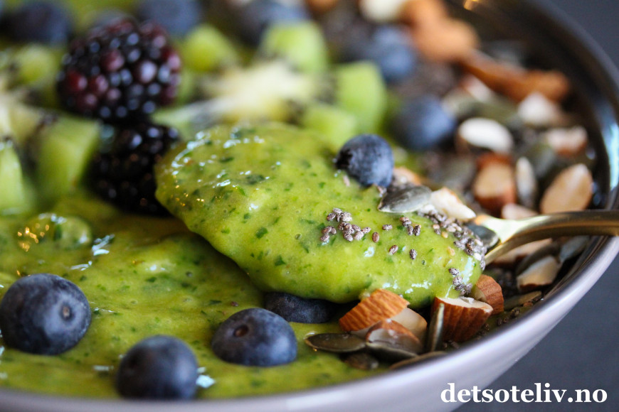 Denne smoothieskålen inneholder mye godt og grønnfargen ser kanskje litt skremmende ut, men på tross av fargen smaker denne smoothien mest av deilig, søt mango.
