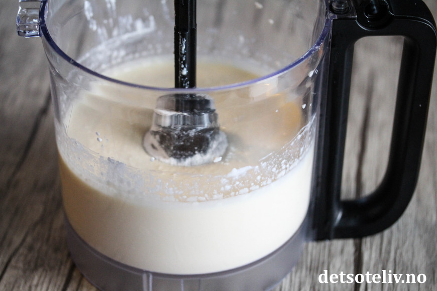 Mos egg og cottage cheese sammen slik at du får en helt glatt og klumpfri masse. Du kan bruke food processor eller stavmikser til dette.