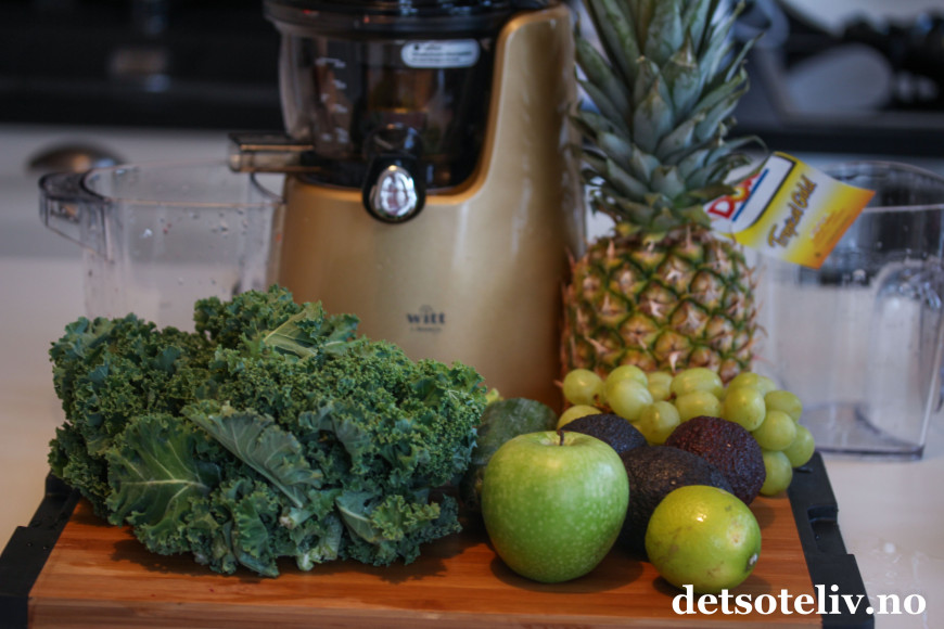 Den enkleste måten å få i seg en solid mengde grønnkål på, er å presse den skånsomt i en Slowjuicer. Jeg blander her grønnkåljuicen med presset juice fra grønt eple, grønne druer og fersk ananas. I tillegg har jeg i en avokado og en skvis lime.