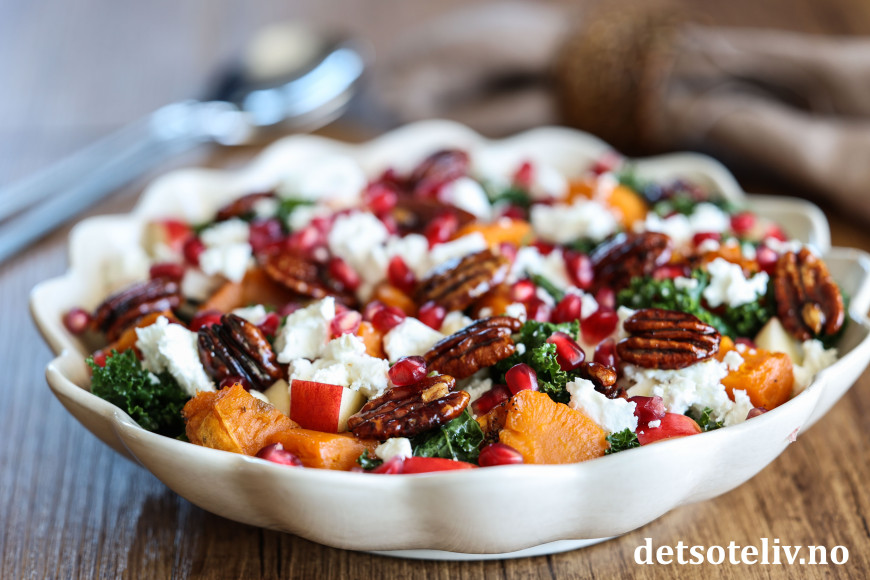 Ovnsbakt søtpotet gjør salaten lun og mettende. Den litt salte fetaosten mot de søte bitene av eple, granateplekjerner og honningglaserte pekannøtter er magisk! 😍