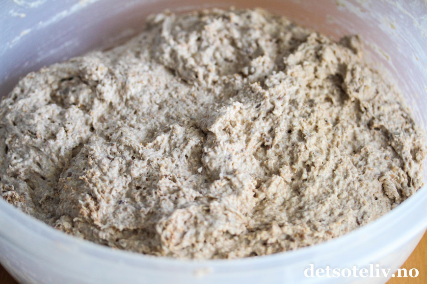 Finn frem en stor rørebolle. Løs opp gjæren i halvparten av det lunkne vannet. Bland i fint sammalt rugmel og grovt sammalt hvetemel.