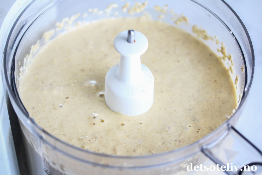 Ha eggene i en food processor. Ha i bananene, bakepulver, vanilje og krydder.