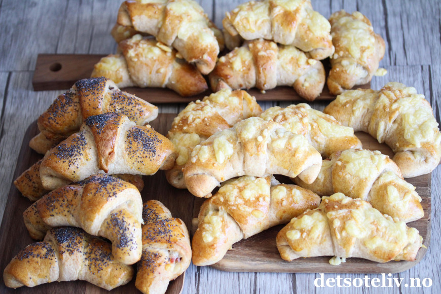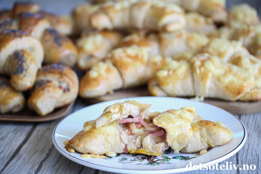 Her har du myke, halvgrove horn, som jeg har fylt med masse ost og skinke.