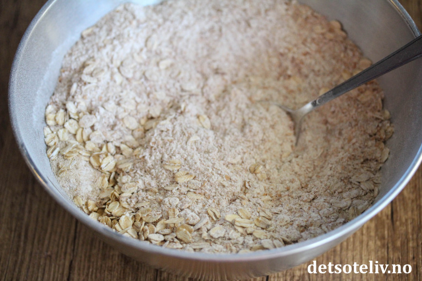 Ha hvetemelet i bakebollen. Bland grovt, sammalt hvetemel med store havregryn og tørrgjær.