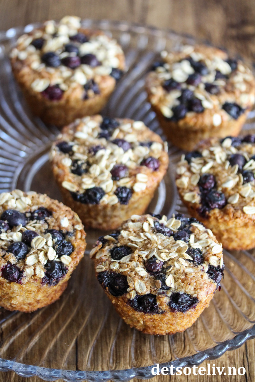 Dette er grove muffins med havregryn, sammalt hvete, revet eple og blåbær.