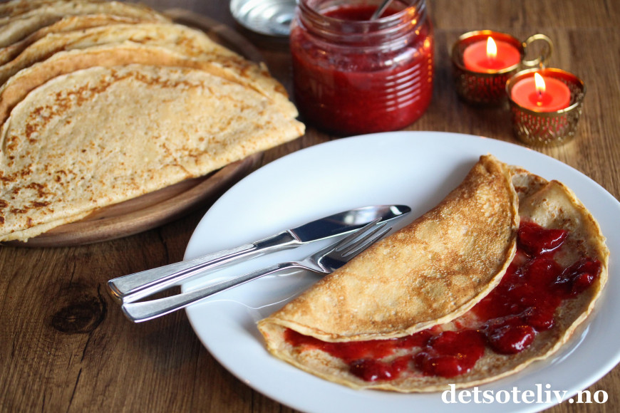 Oppskriften gir 15-17 pannekaker. Serveres gjerne med rørt jordbærsyltetøy!