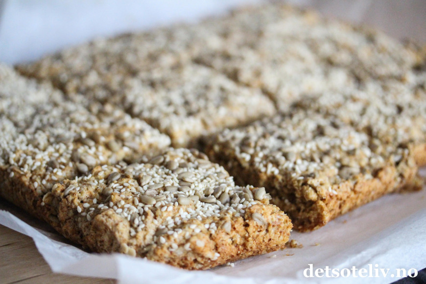 Strø over solsikkefrø og sesamfrø og trykk frøene lett ned i deigen så de fester seg.