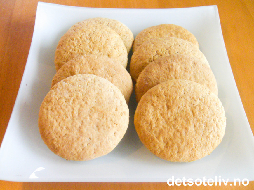 Kjevle ut deigen og trykk ut runde kaker med et melkeglass (se tips). Legg kakene på bakepapirdekkede stekeplater og stek dem midt i ovnen ved 200°C i ca 10 min, eller til de er lysebrune. Avkjøles på rist.