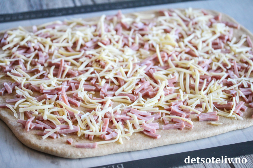 Vil du lage skinkesnurrene veldig barnevennlige, så dropp tomatpuré og tørkede urter. Bare dryss skinken rett på leiven. Deretter revet ost.