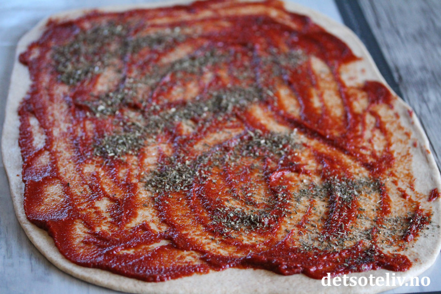 Dersom du ønsker å bruke tomatpuré og tørkede urter, has dette først på leiven.