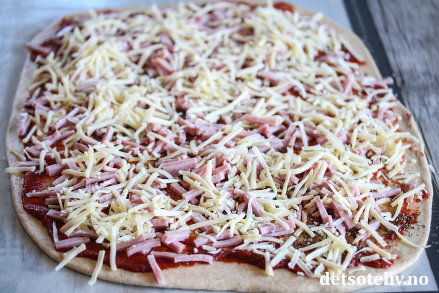 Dersom du ønsker å bruke tomatpuré og tørkede urter, has dette først på leiven. Deretter fordel over skinke og revet ost.