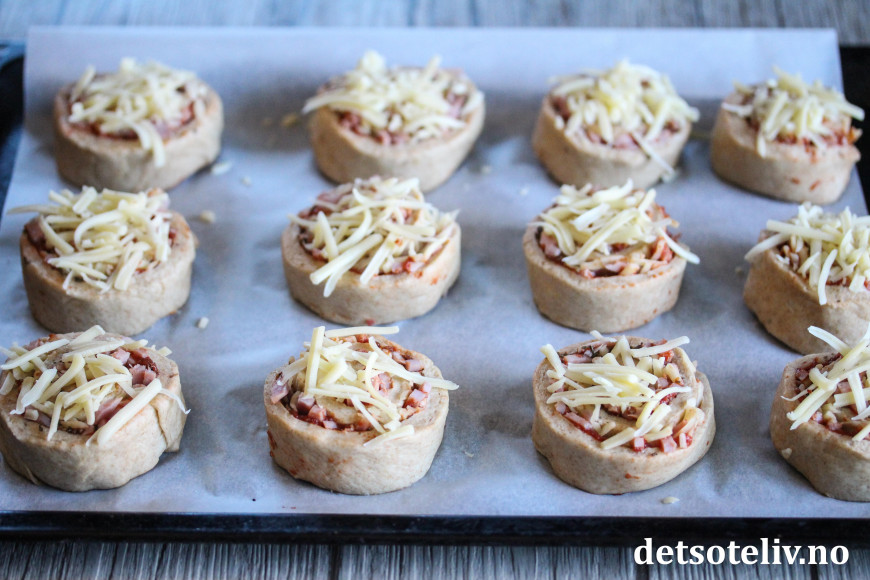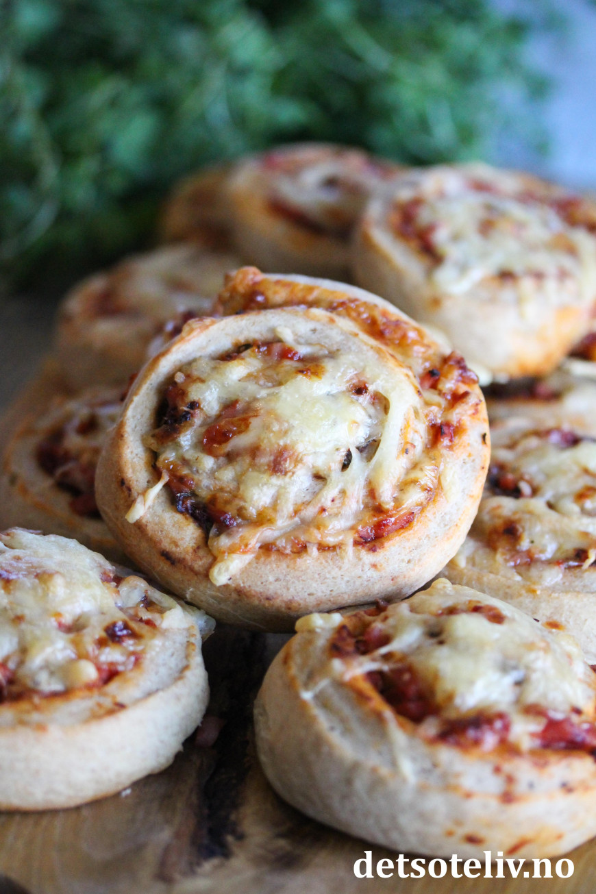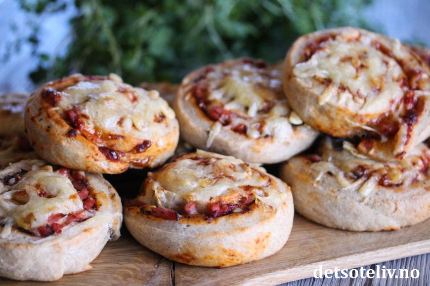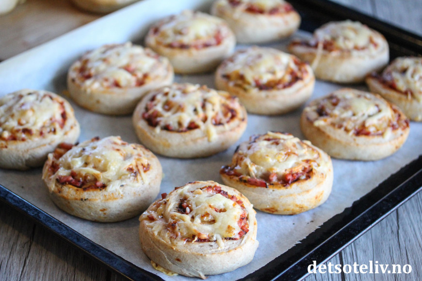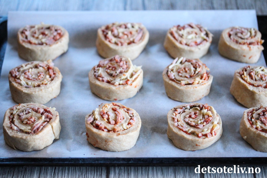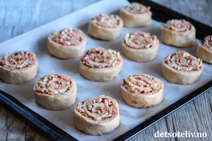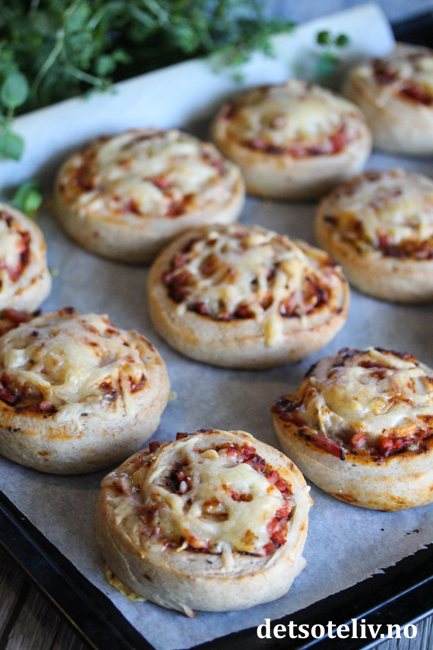 Skinkesnurrer med tomatpuré og tørkede urter minner nokså mye om pizzasnurrer.