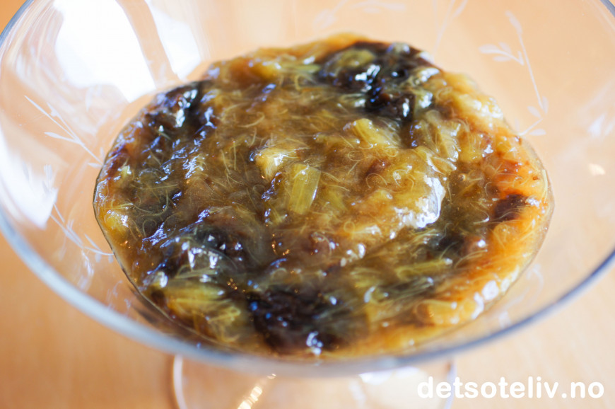 Desserten består først av en deilig kompott laget på svisker og rabarbra. Rabarbra er jo et sikkert vårtegn, så det er kanskje ikke så rart at den er med i en 17. mai-desserten!