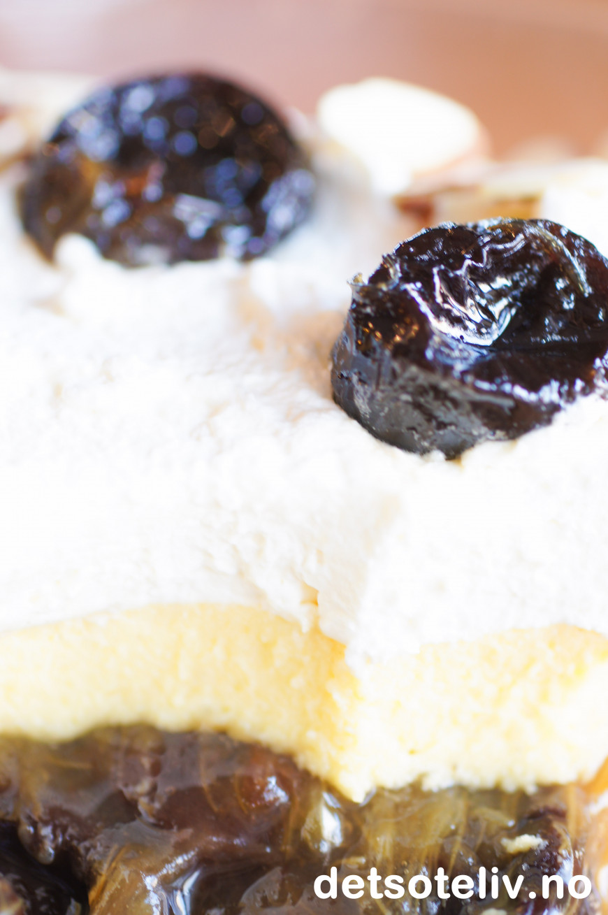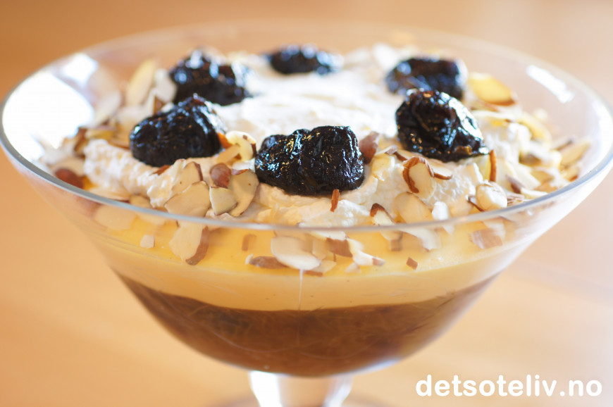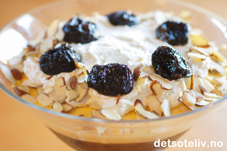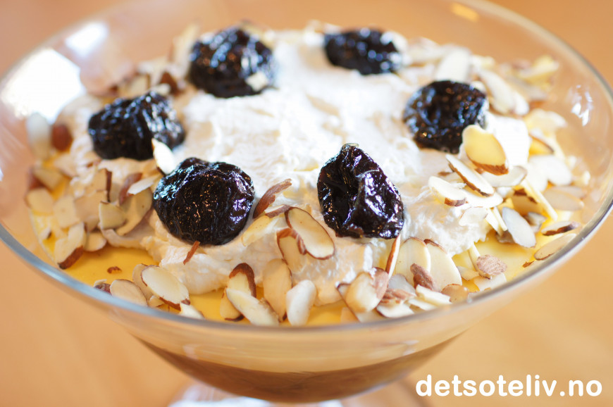 Denne kompotten dekkes så med en nydelig vaniljefromasj og pyntes med pisket krem, mandelflak og svisker.