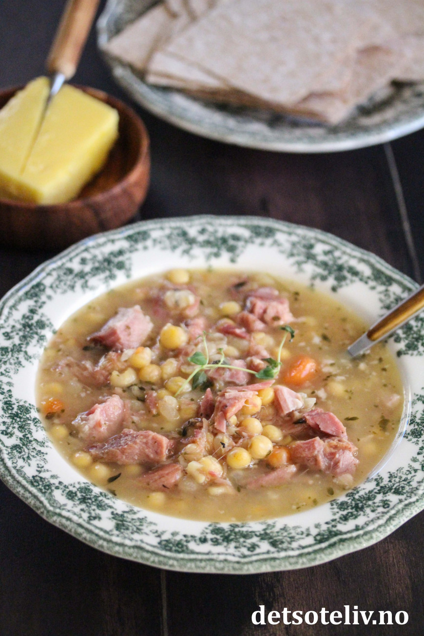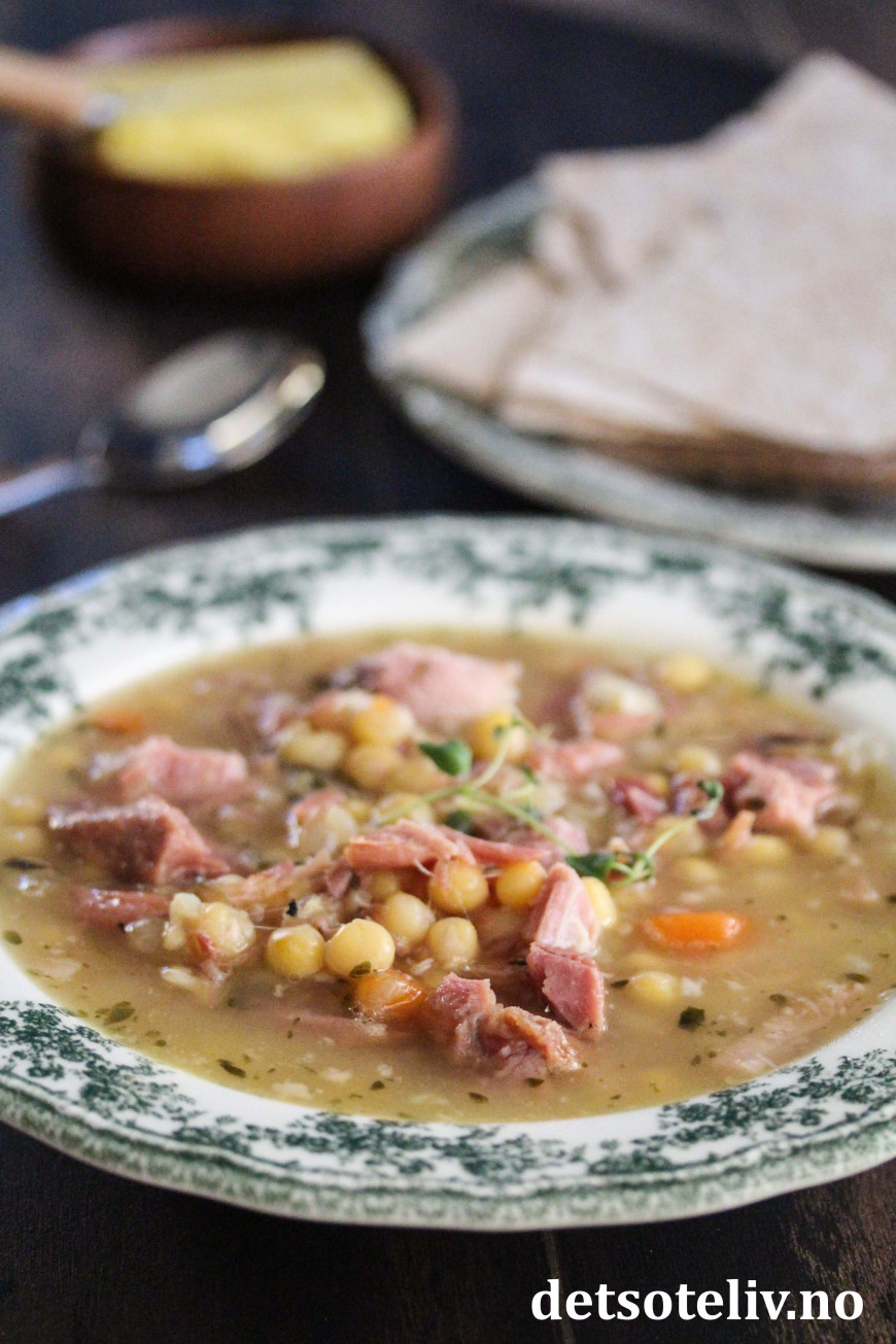 Tilsett gule erter og grønnsaker etter smak, og du har en næringsrik og mettende suppe. Serveres med flatbrød eller brød og godt smør. Noen synes at også pannekaker hører med! 😊