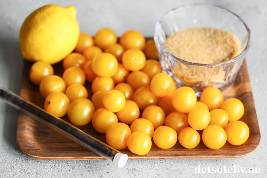 Del de gule cherrytomatene på midten og ha dem i en kjele sammen med vann, presset sitronsaft og brunt sukker. Snitt opp vaniljestangen og skrap ut vaniljefrøene. Ha både vaniljefrø og selve vaniljestangen i kjelen.