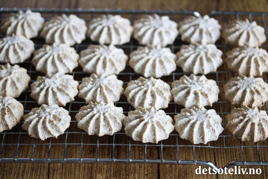 Stek kakene midt i ovnen ved 180 °C i ca. 12-15 minutter. Avkjøl kakene på platen før de etter hvert flyttes over på rist og avkjøles helt.