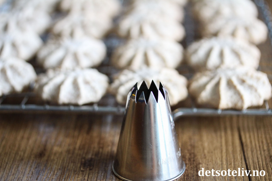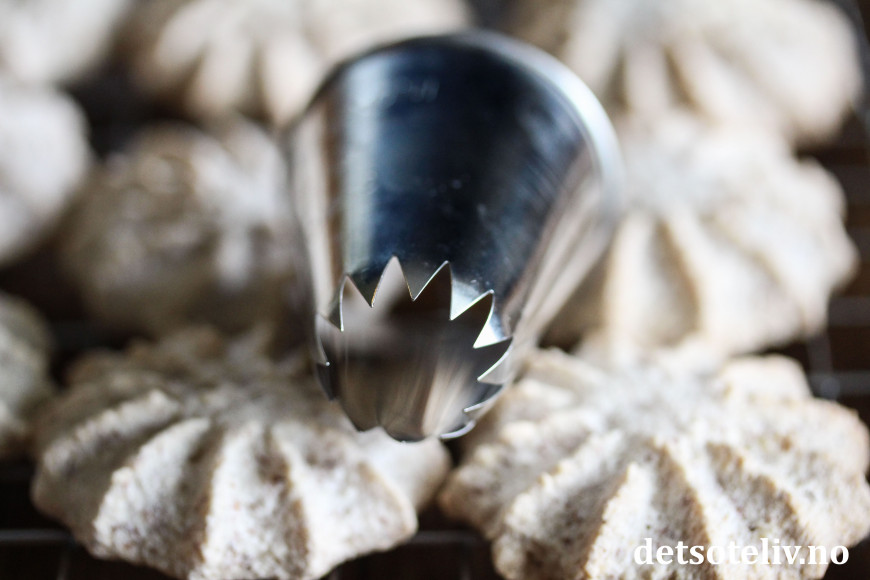 ♥ Jeg synes kakene blir best om man maler mandler på den gammeldagse måten med mandelkvern. Mandelkvern fås kjøpt i de fleste kjøkkenutstyrsbutikker og koster ikke mye. Hvis jeg maler mandlene i food processor, synes jeg mandlene blir for grovkornet. Og bruker jeg ferdigkjøpt mandelmel (som er vanlig å bruke når man lager franske makroner), synes jeg på den annen side at det blir for finmalt. Av disse to alternativene, ville jeg nok gått for mandelmel og så heller tilsatt litt mindre eggehvite. Det er viktig at deigen ikke blir så løs at kakene ikke holder fasongen, så prøv deg frem og stek en prøvekake hvis du er usikker.