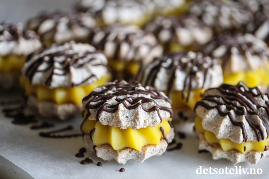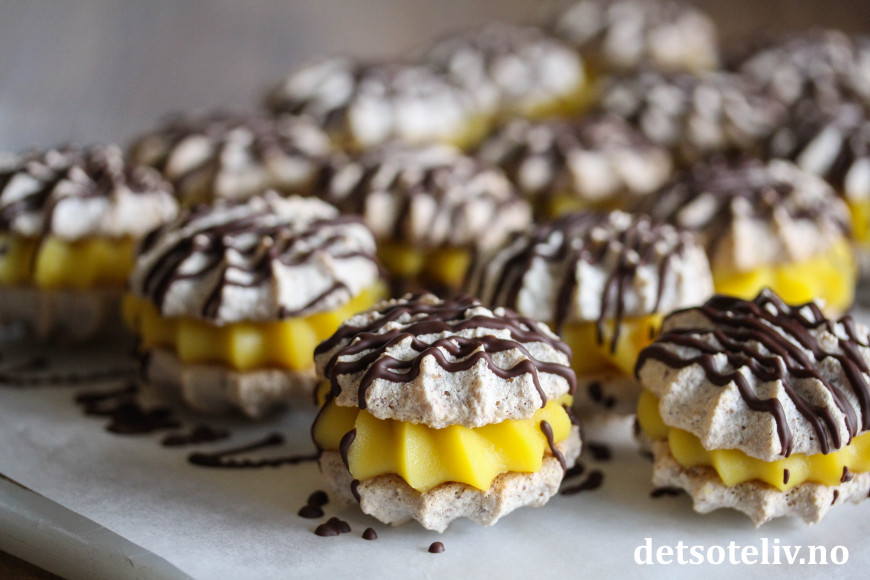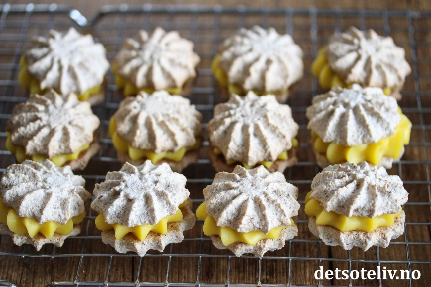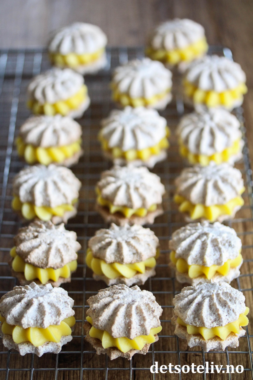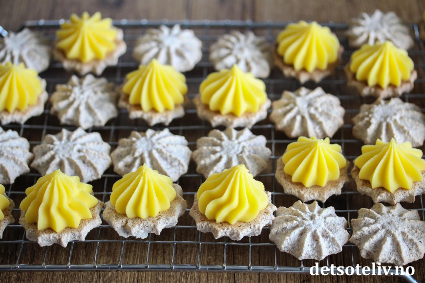 Sett sammen to og to mandelkaker med gul krem imellom.