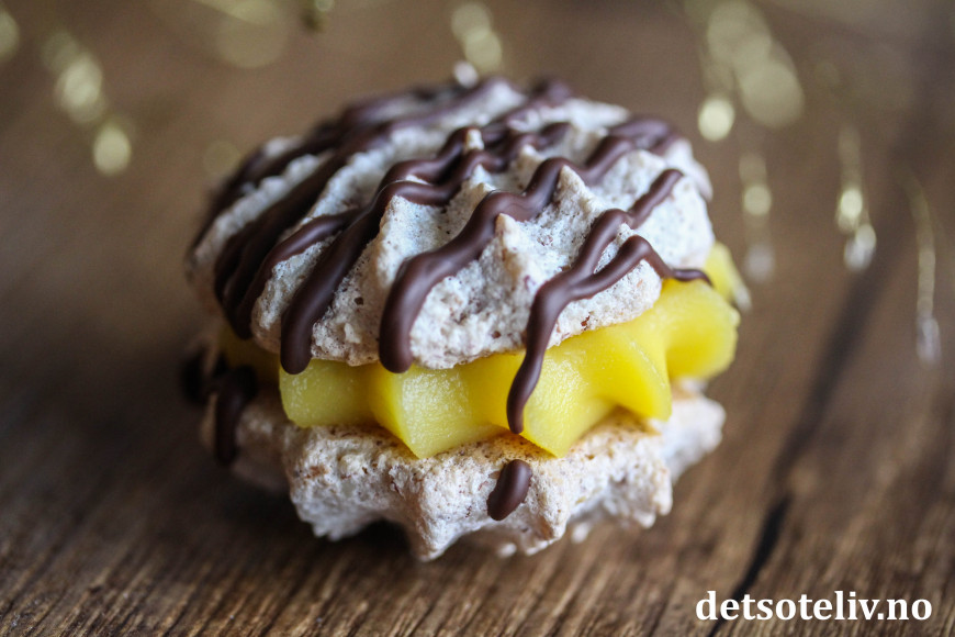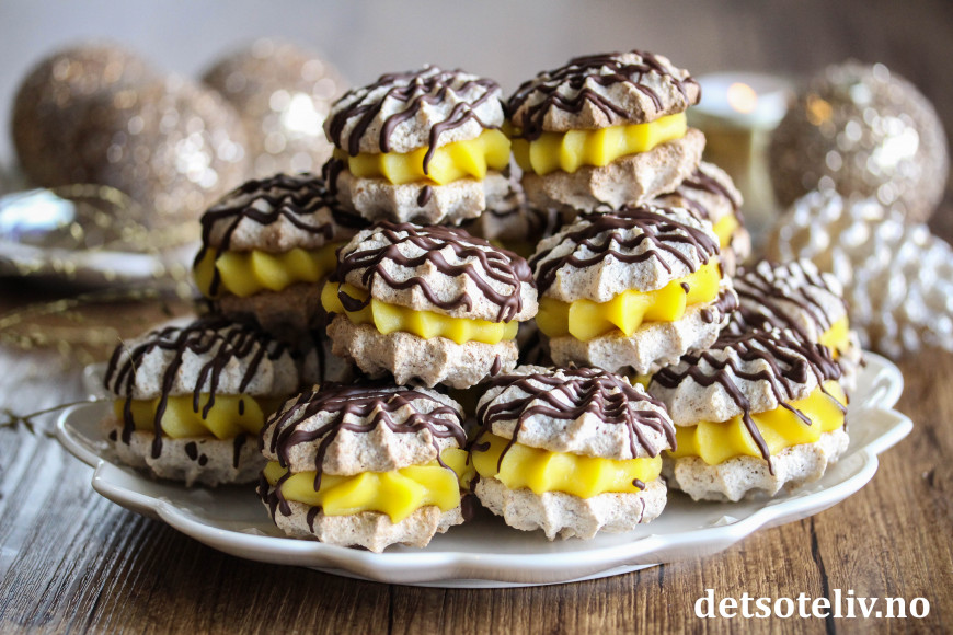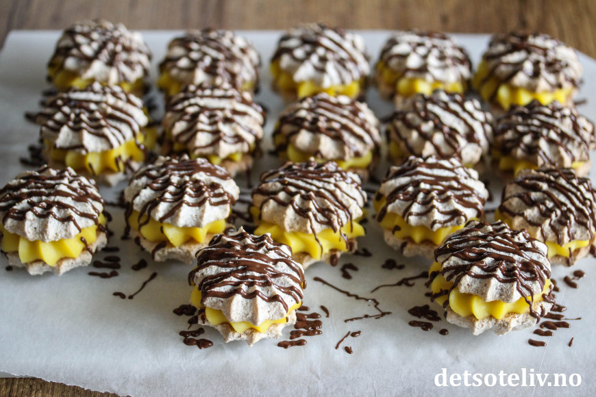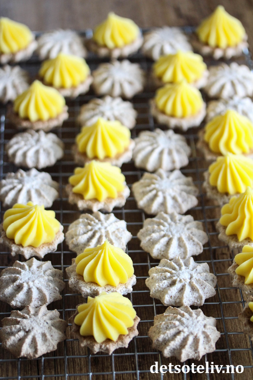 Gule bomber har vært den desidert mest brukte kakeoppskriften denne julen. Ikke tvil om at dette er en ny julekakeklassiker! Jeg har tidligere publisert oppskriften i innlegget Gule bomber (Suksesskaker). Gule bomber består av myke mandelkaker som legges sammen med gul krem og pyntes med mørk sjokolade. Jeg lagde kakene på nytt til julekakeboken etter samme oppskrift, bare at jeg denne gangen har pyntet med ringlet sjokolade i stedet for å dyppe halve kakene i smeltet sjokolade.