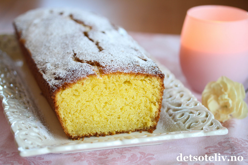 Ha deigen i en smurt brødform som rommer 2 liter (ha gjerne et stykke bakepapir i bunnen av formen, slik at kaken er lett å få ut). Stek kaken på rist nederst i ovnen ved 175°C i 40-45 min. Avkjøl kaken i formen. Løsne den så fra formen med en tynn, skarp kniv og hvelv den ut av formen. Sett kaken på et passende fat.