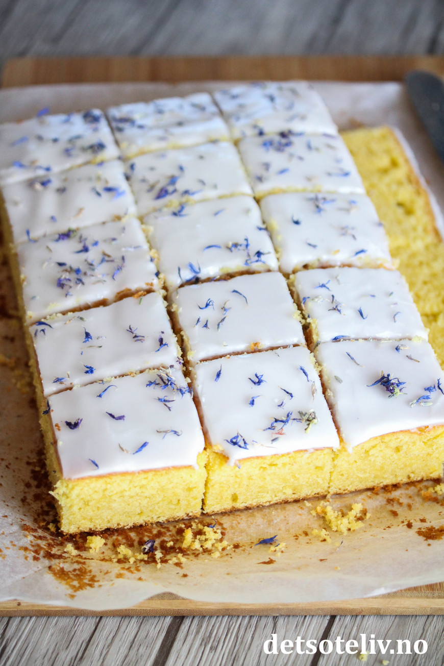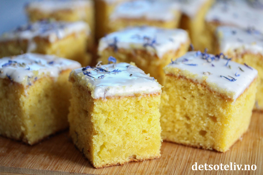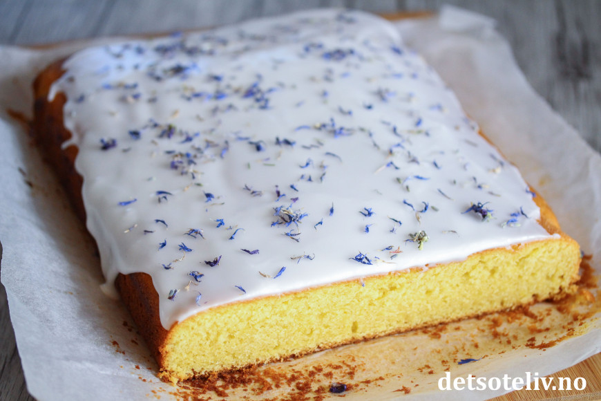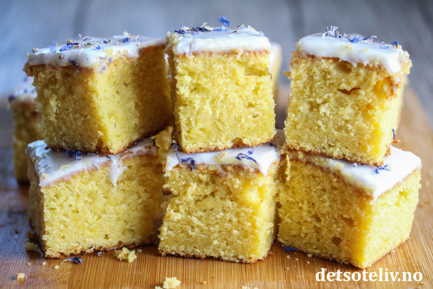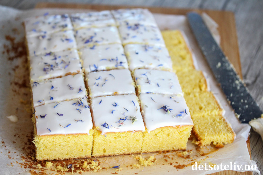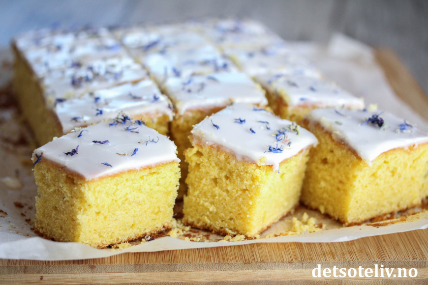 Da jeg forleden lagde Angel Food Cake fikk jeg mange eggeplommer til overs, og de brukte jeg da til å lage denne nydelige Gullkaken med sitron i langpanneversjon.
