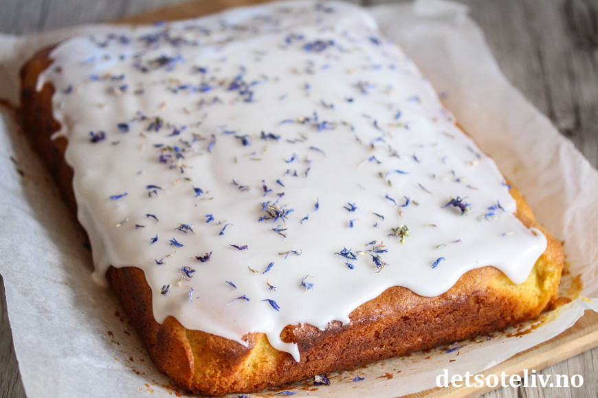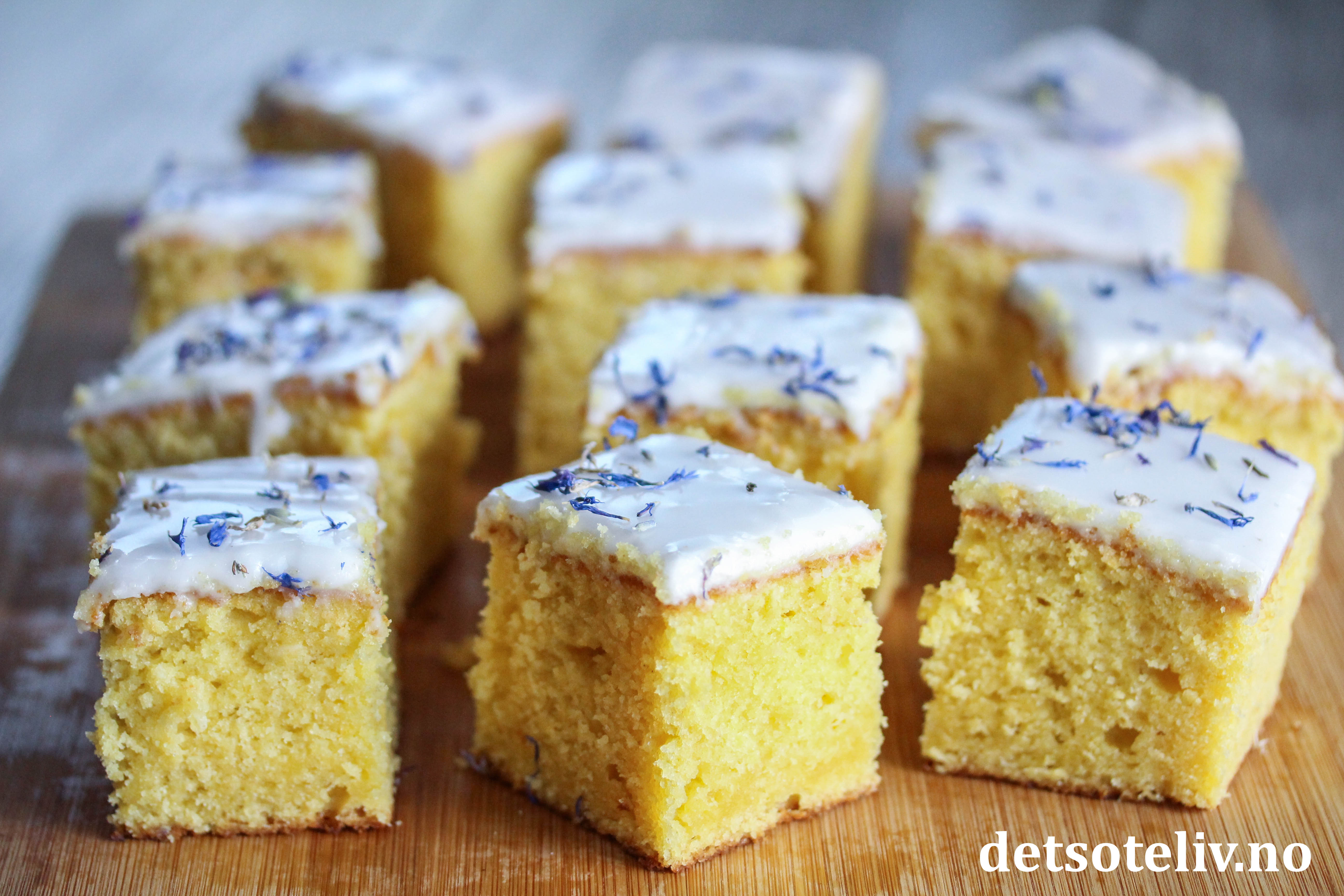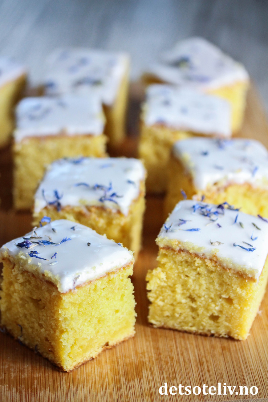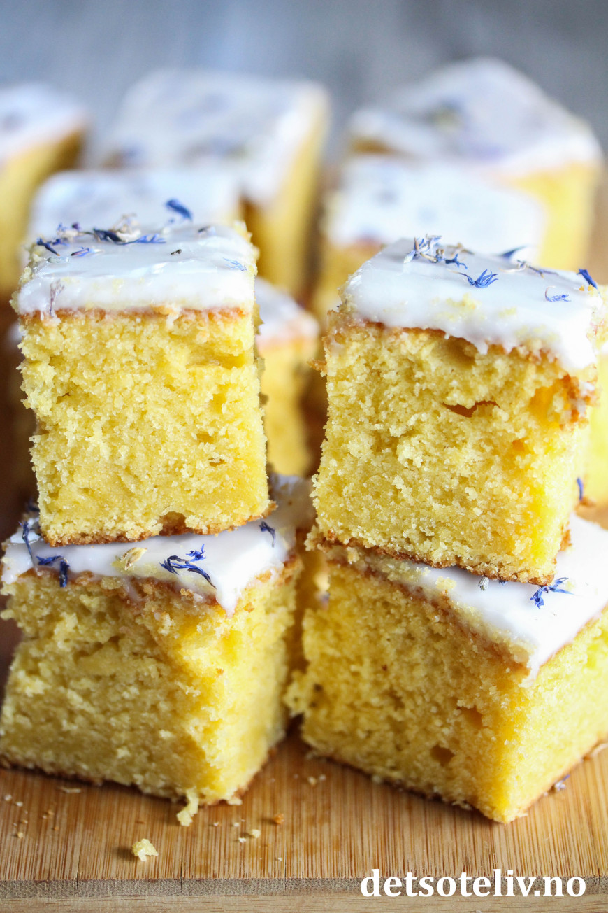 Da jeg forleden lagde Angel Food Cake fikk jeg mange eggeplommer til overs, og de brukte jeg da til å lage denne nydelige Gullkaken med sitron i langpanneversjon.